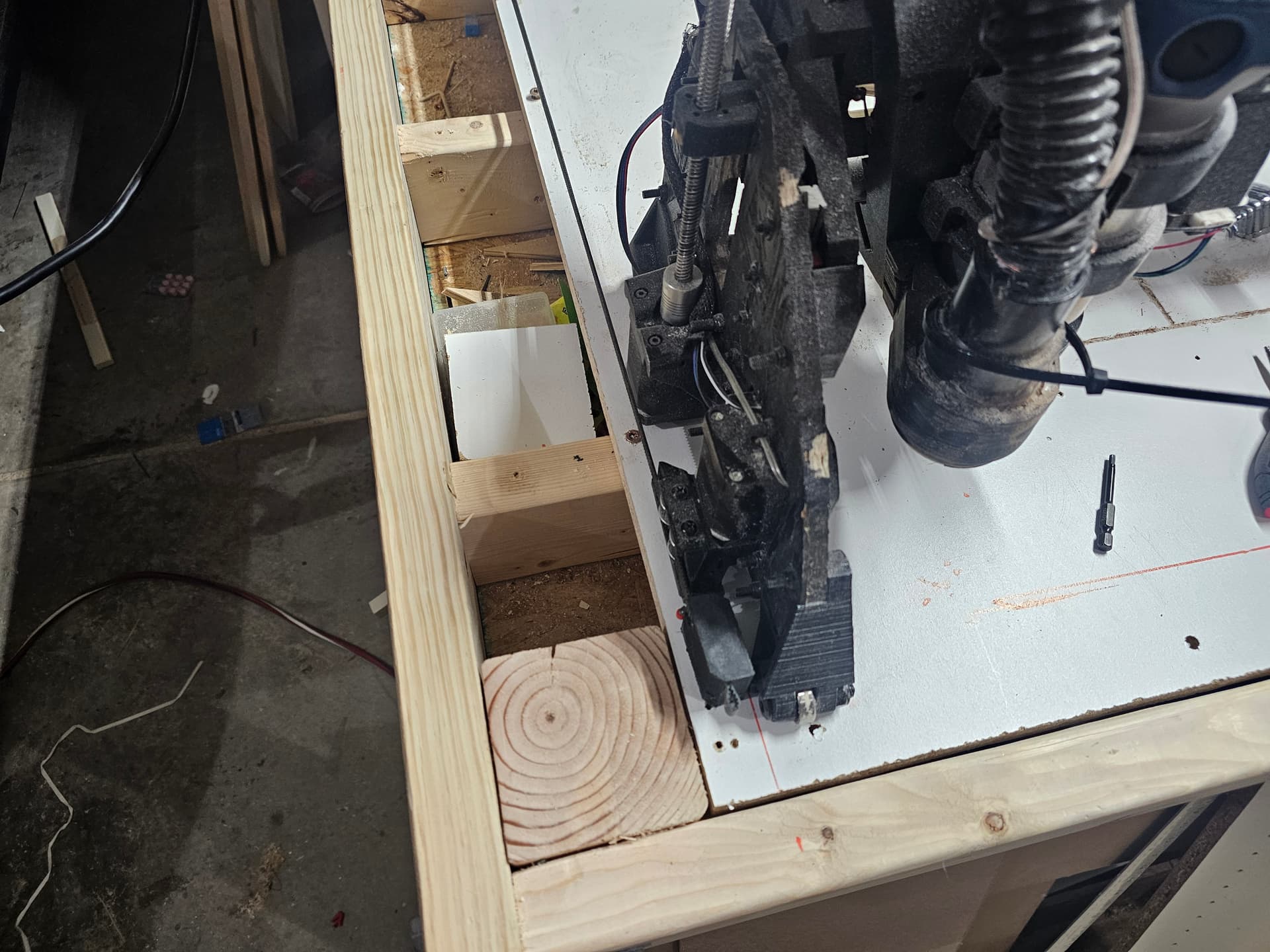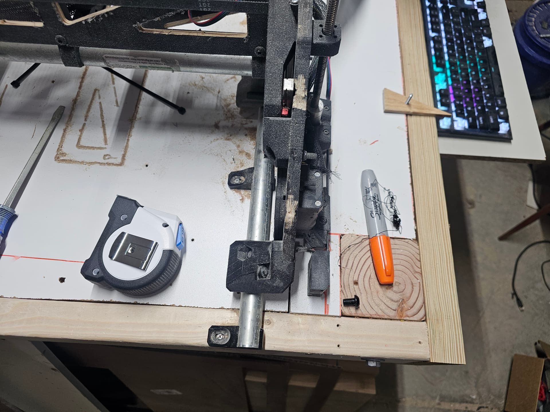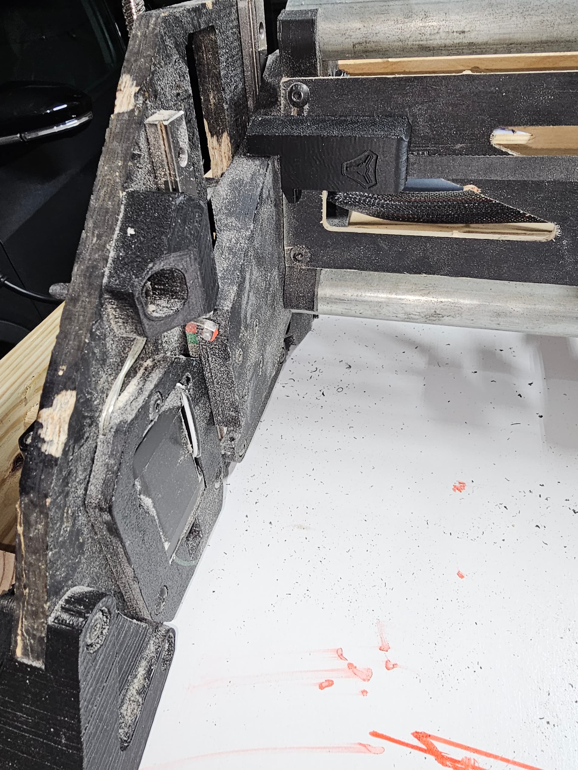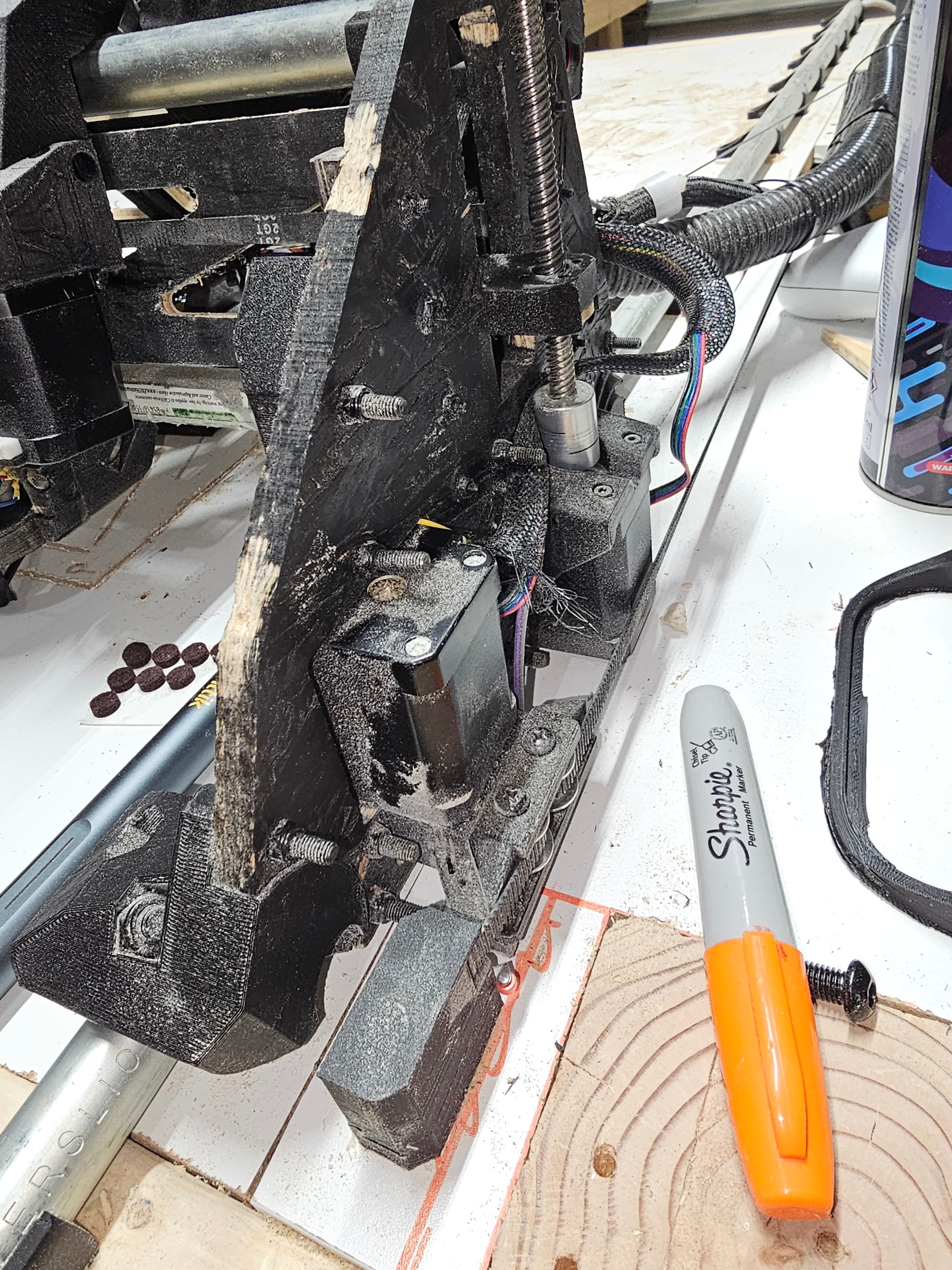 I have been struggling to square the x axis. What I mean by that is that when I measure from the bottom edge of the table with y=0, the spindle is about 1/4 to 1/2 inch closer to the bottom edge of the table when at x min vs x max(800mm). Y axis movements do not seem to suffer from the issue. The spindle is roughly the same distance to the left edge regardless of the y position. When I try to adjust the squaring to get the x axis parallel to the bottom edge of the table, the gantry lifts slightly off the rail which makes me think something is off with either the placement of the stop blocks or I goofed something with the x axis strut assembly.
